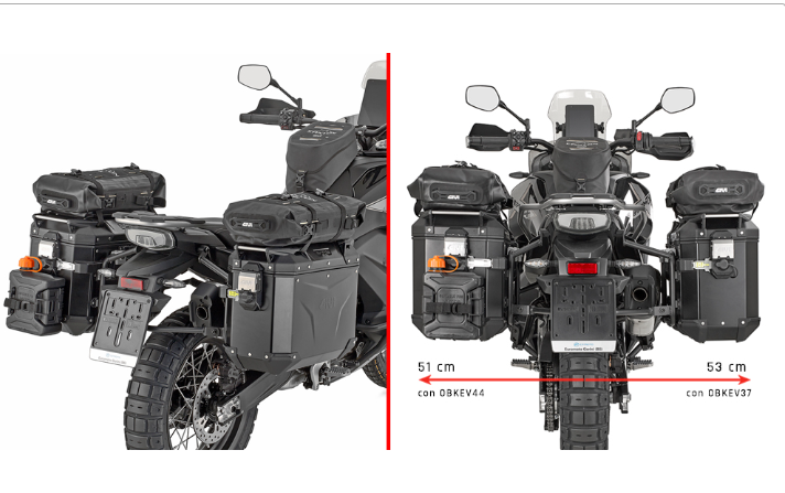 Portavaligie laterale specifico PL ONE-FIT configurato per valigie MONOKEY® CAM-SIDE Trekker Outback, o borse laterali MONOKEY® CAM-SIDE Canyon