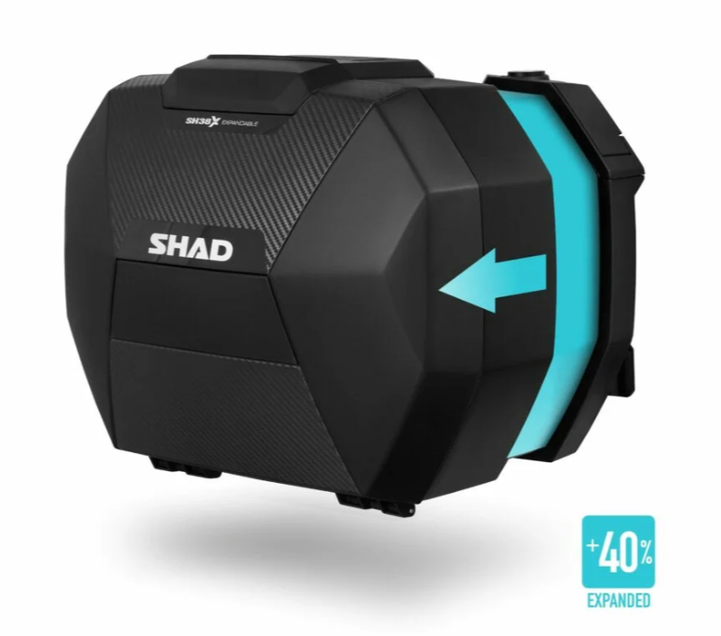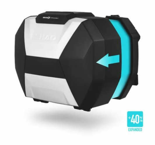 L’SH38X si espande di +70 mm, il che aumenta il suo volume del 40%, consentendo di riporre all’interno un casco modulare XL (ECE 22-06). In questo modo l’SH38X diventa la valigia laterale espandibile per un casco più compatta sul mercato.